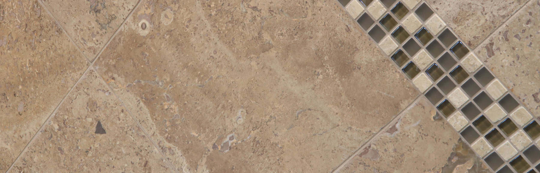 Travertine Noce Honed: A rich brown travertine tile, honed and filled at the factory. Available in 12”x12” tiles, as well as slabs for countertops and sills.