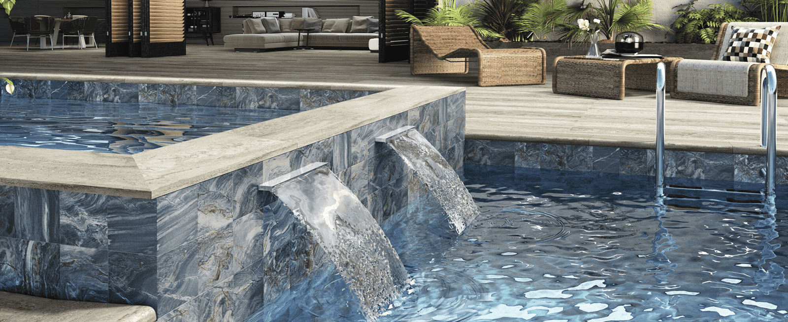Deep Blue Oxid pool tile is a textured, frost-proof, porcelain tile suitable for both pools and bathrooms. It’s high resistance to cleaning products, chemical products in swimming pool water and slip resistance makes it ideal in and around pool areas. The colors reflect the shades of the water and blend with the natural surroundings. Inspired by the iconic images of the depths of the sea, coral reefs and seagrass meadows of the Mediterranean – Deep Blue will enhance the beauty of any pool landscaping project.